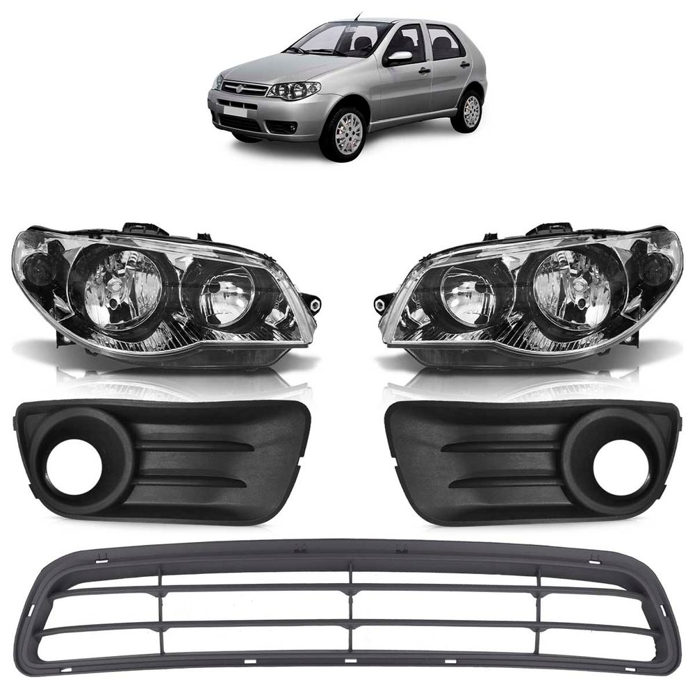 Kit Fiat Palio Economy 2011 2012 2013 2014 2015 2016 2017 Par Farol Dianteiro Máscara Cromada Canhão Preto + Par Moldura Grade do Milha Com Furo para Milha + Grade Inferior Dianteira Preta