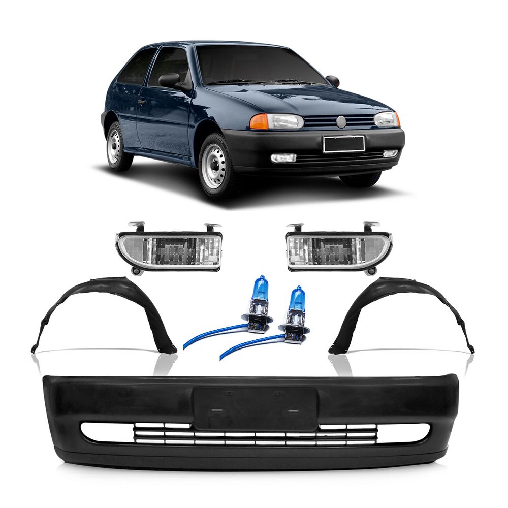 Kit Parachoque Dianteiro Preto + Par Farol de Milha + Par Lâmpada Super Branca + Par Parabarro Dianteiro Volkswagen Gol G2 Bola 1995 1996 1997 1998 1999