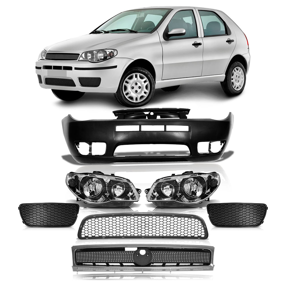 - DESCRIÇÃOKit Palio G3 2004 2005 2006 2007 2008 2009 Par Farol Máscara Cromada Canhão Preto + Parachoque Dianteiro Liso + Par Grade do Milha S/Furo + Grade Central + Grade Dianteira Cinza Com moldura Cromada