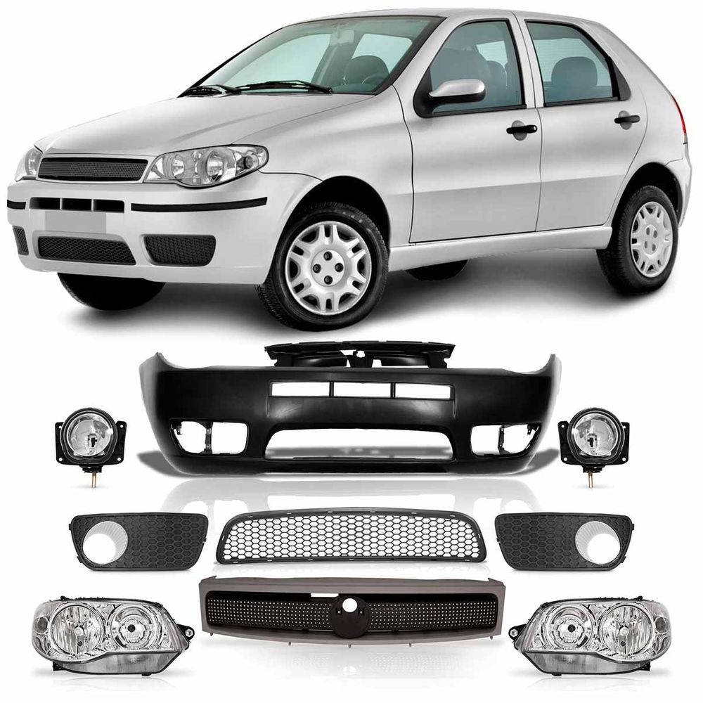 - Kit Palio G3 2004 2005 2006 2007 2008 2009 Par Farol Máscara Cromada + Parachoque Dianteiro Liso + Grade Milha C/Furo + Grade central + Grade Dianteira Cinza Com Moldura Primer + Par Farol de Milha