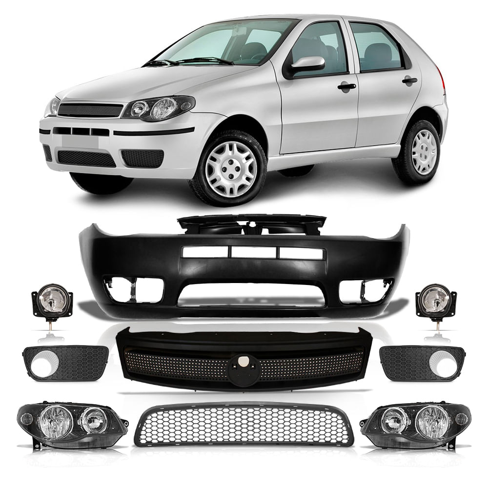 - Kit Palio G3 2004 2005 2006 2007 2008 2009 Par Farol Máscara Negra Canhão Cromado + Parachoque Dianteiro Preto liso + Grade Milha C/Furo + Grade central + Grade Dianteira Cinza Com Moldura Preta + Par Farol de Milha