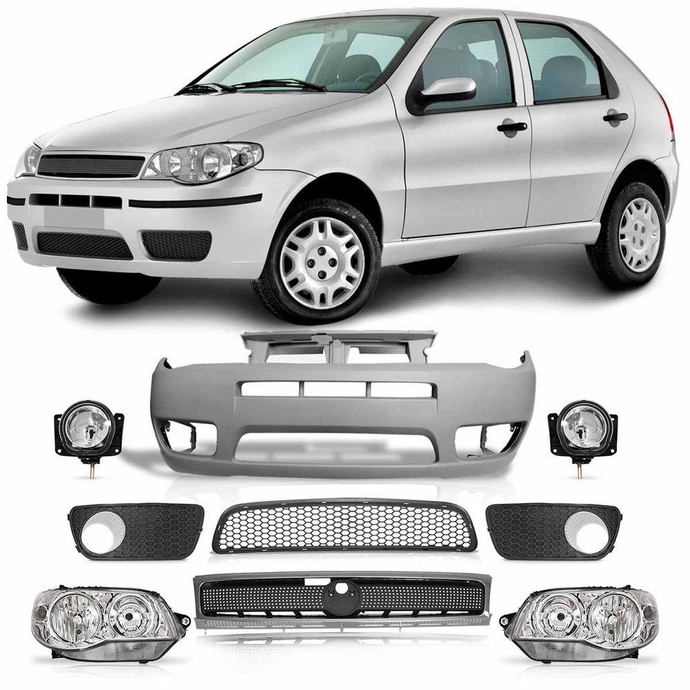 - Kit Palio G3 2004 2005 2006 2007 2008 2009 Par Farol Máscara Cromada + Parachoque Dianteiro Primer + Grade Milha C/Furo + Grade central + Grade Dianteira Cinza Com Moldura Cromada + Par Farol de Milha