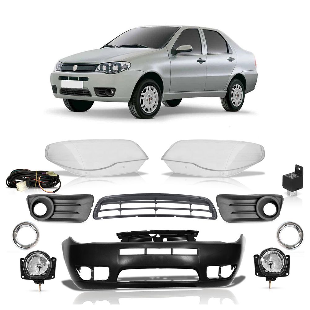 - DESCRIÇÃOKit Siena Fire 2011 2012 2013 Par Lente do Farol + Farol de Milha Completo Aro Cromado + Grade Central Preta + Parachoque Dianteiro Preto Liso